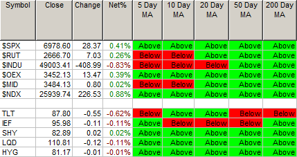 Moving Average Table: 73% from 87% of Equities are Positive, and 76% from 92% of Bonds are Positive.