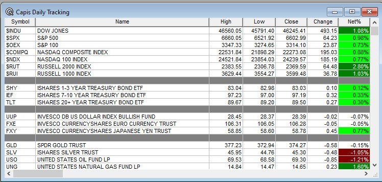 • The S&P 500 finished Friday higher by 0.98% at 6602.99 from Thursday lower by -1.56% at 6538.76.