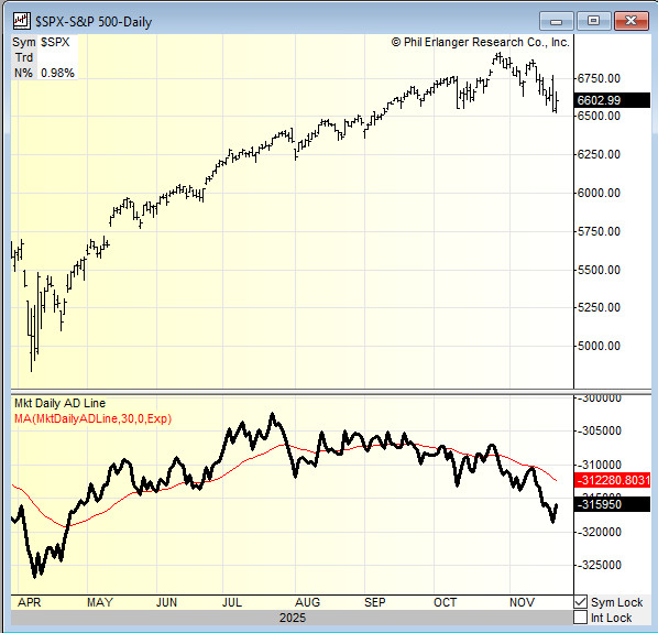 • Only 44.80% of stocks in the Erlanger Universe are higher for 2025. Tax selling could be an issue in December.