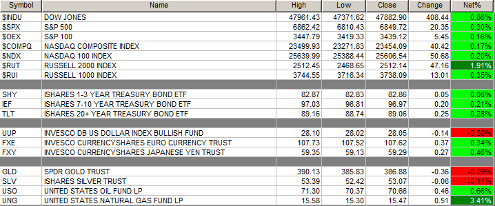 - Futures S&P 500 +6 NASDAQ 100 +7 Dow Jones +53 Russell 2000 -1 Europe is higher and Asia is mixed. Bond yield is at 4.081% from 4.063% on the 10-Year. Crude Oil and Brent Crude are higher with Natural Gas higher. Gold, Silver and Copper are lower. The U.S. Dollar is lower versus the Euro, lower against the Pound and lower against the Yen. Bitcoin is at $92,991 from $92,892 on Wednesday lower by -0.12% which is at $-115.