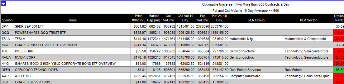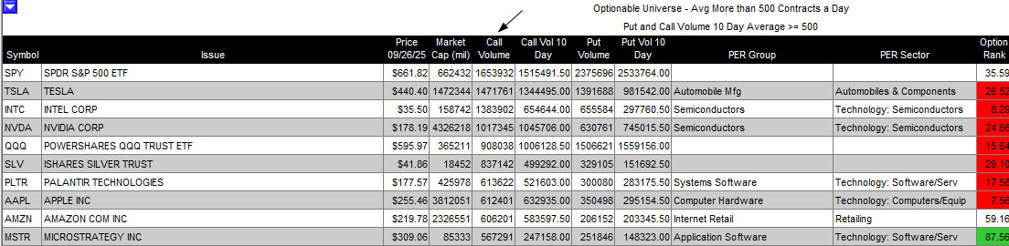 Options Activity: Calls and Puts Top Ten Names Sorted Volume. Highlighted names are new to the most active list.